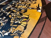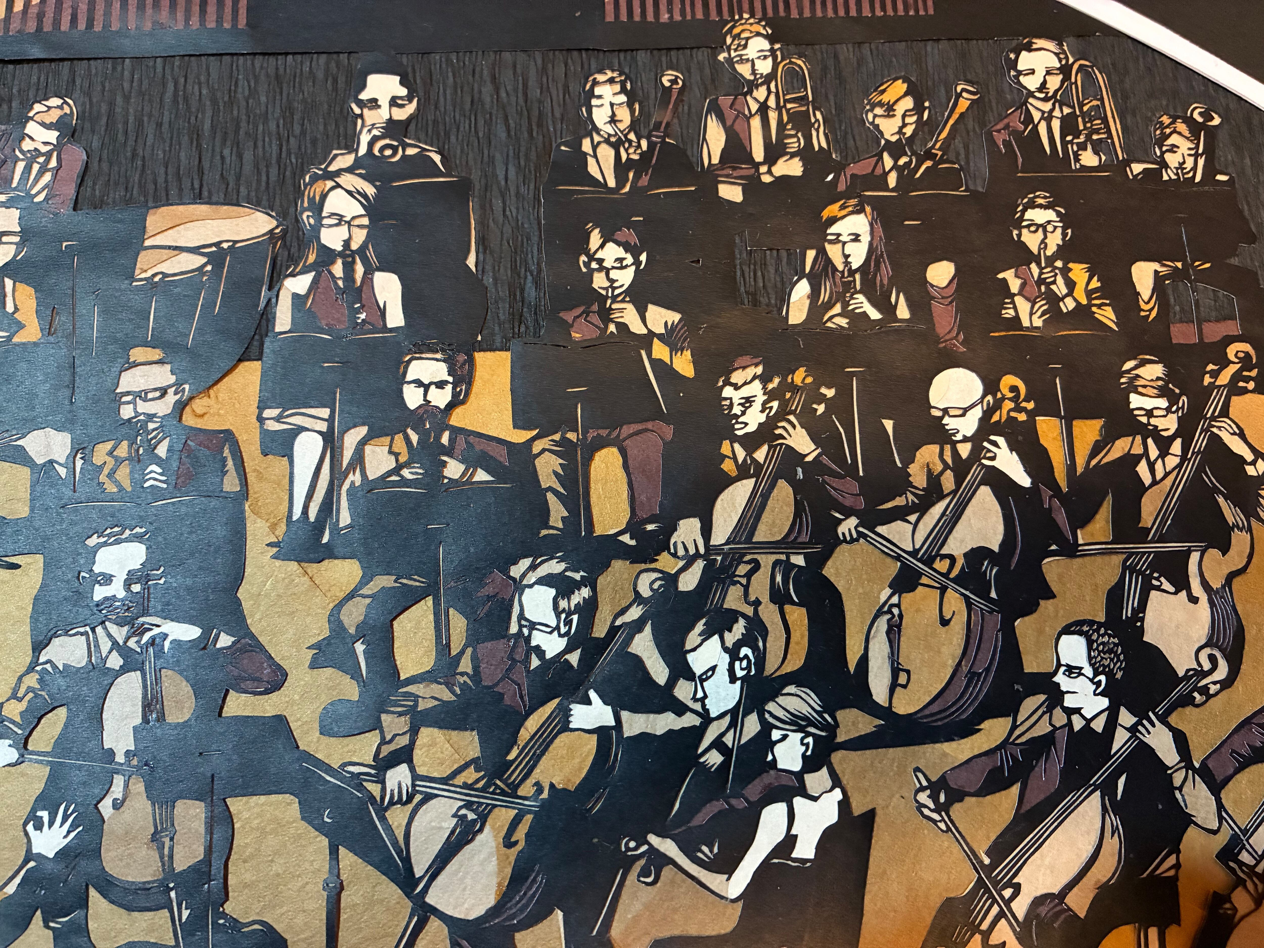 扇型のような整列された隊列に、個性豊かな顔ぶれが並びます。セピアに統一された色彩の中で、「多様性」と「統一感」の共存を表現しています。眺めていると音が聞こえてきそうな…、そんな作品です!触れてもらえば紙の質感を楽しめて五感で楽しめます!
