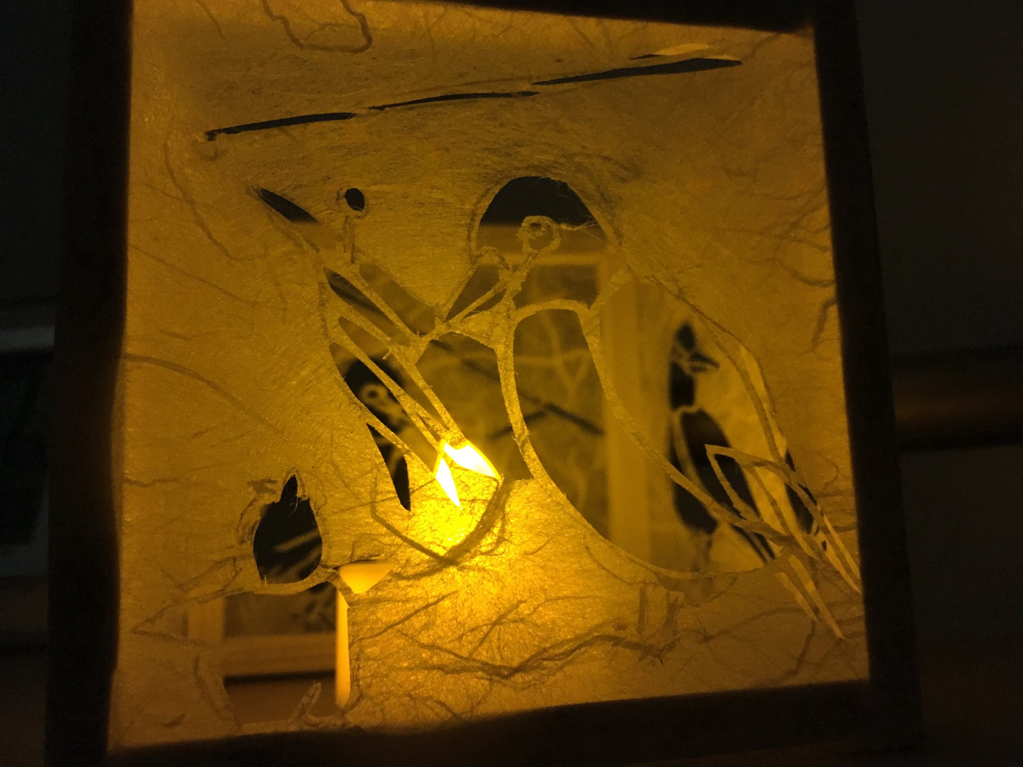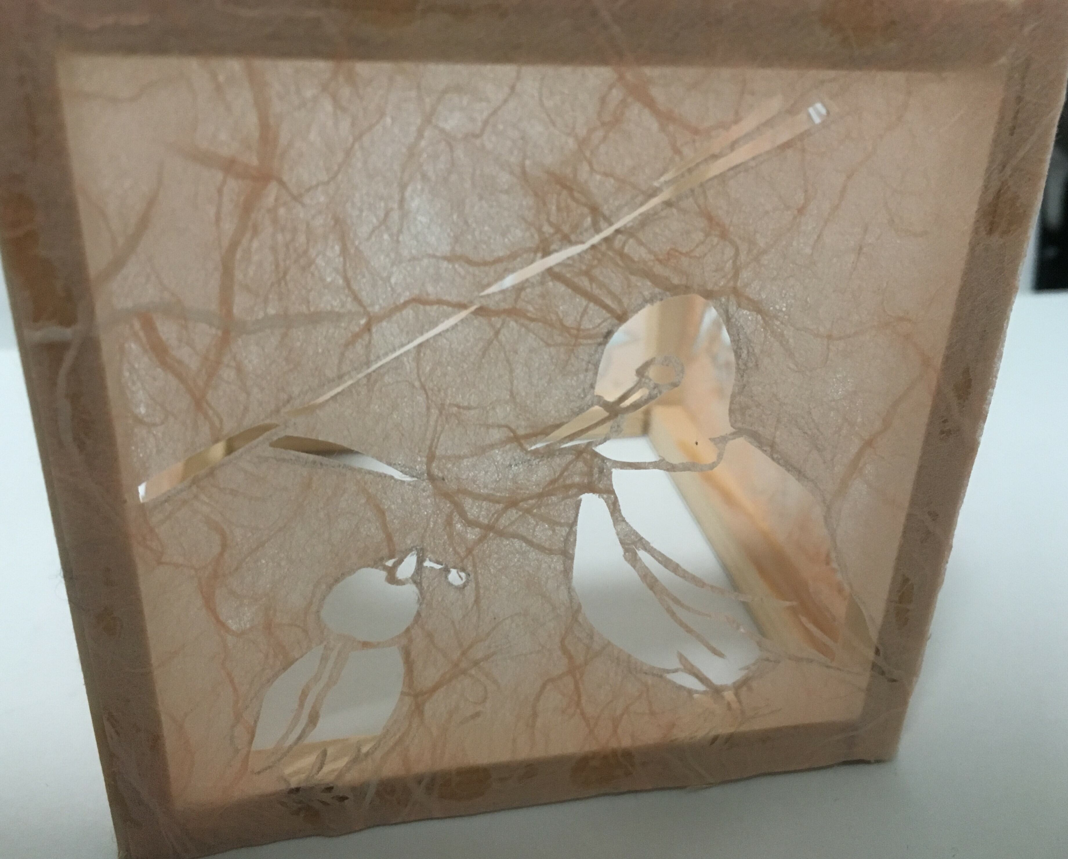 手作りランプシェード。側面の和紙が切り絵になっており、小鳥の親鳥とヒナのほほえましい日常を描いています。置き型で、木枠のためとても軽量です。機能的な照明ではありませんが、ベッド枕もとのインテリアとしてご利用いただけます。ときどき向きを変えて、小鳥の4コマ漫画をお楽しみください。